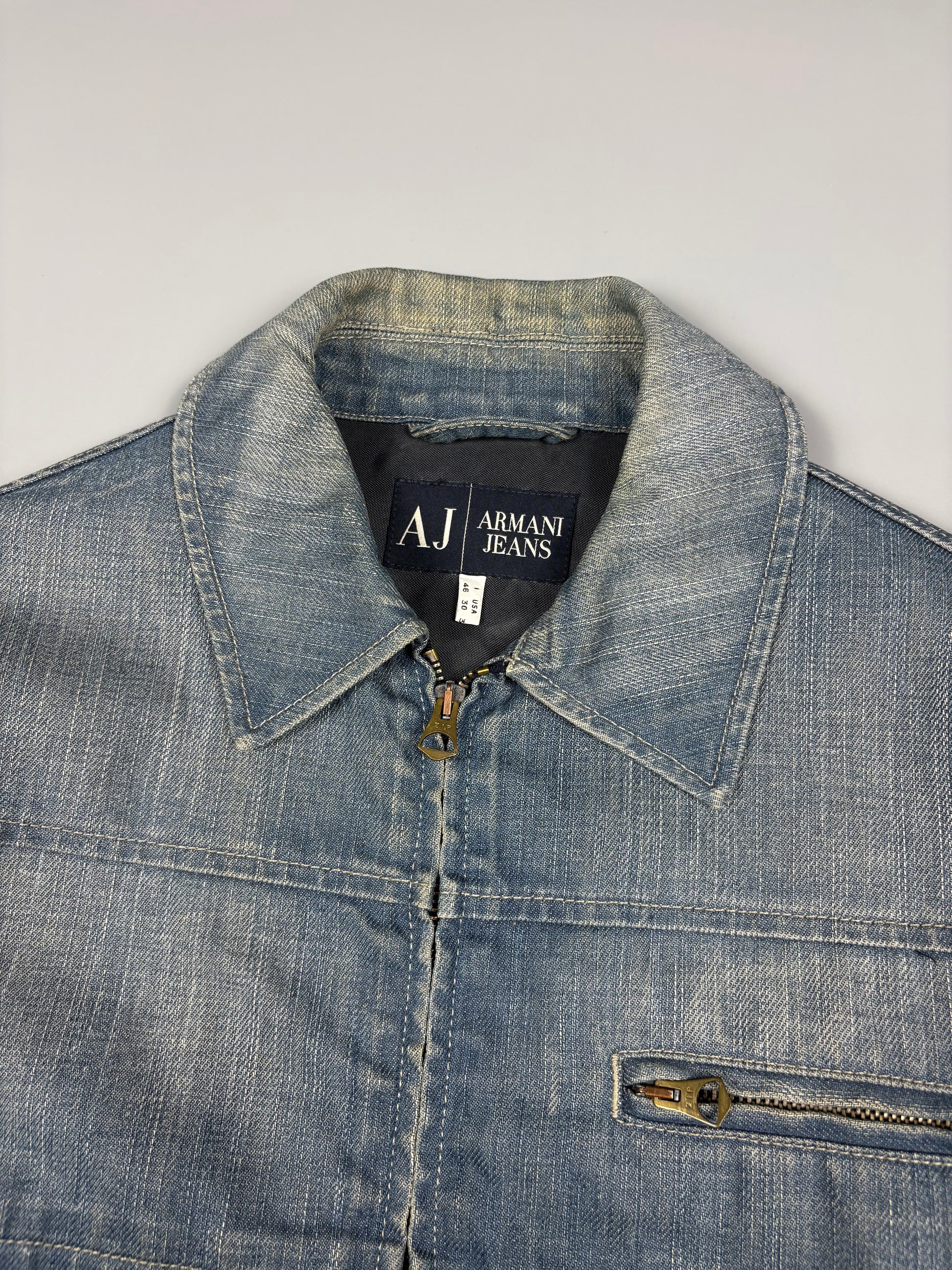 2000s Armani Jeans denim jacket, indigo denim w/ embroidered back hit and double zip