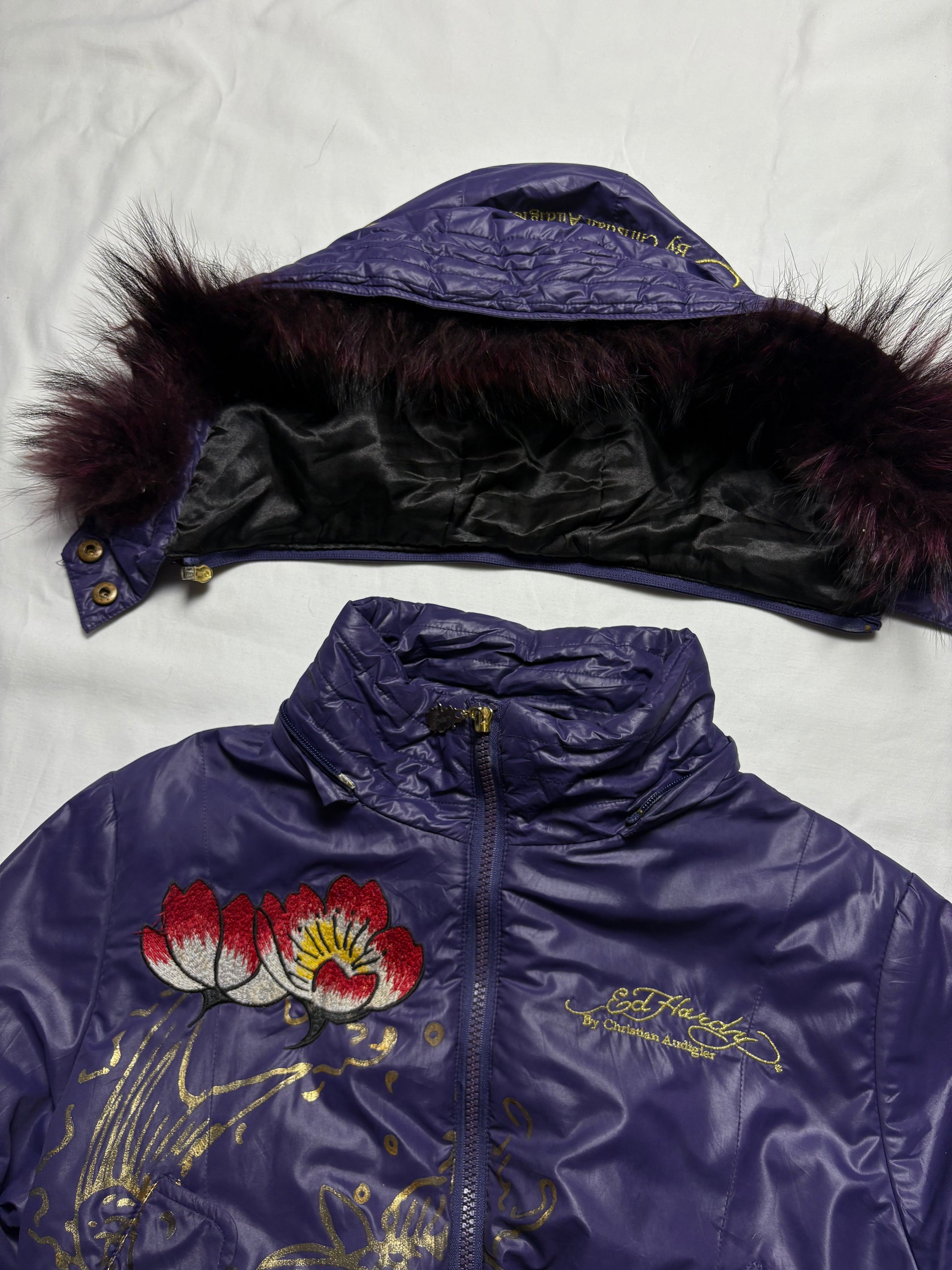 Ed Hardy 2000s Embroidered Purple Puffer Jacket (women's M)