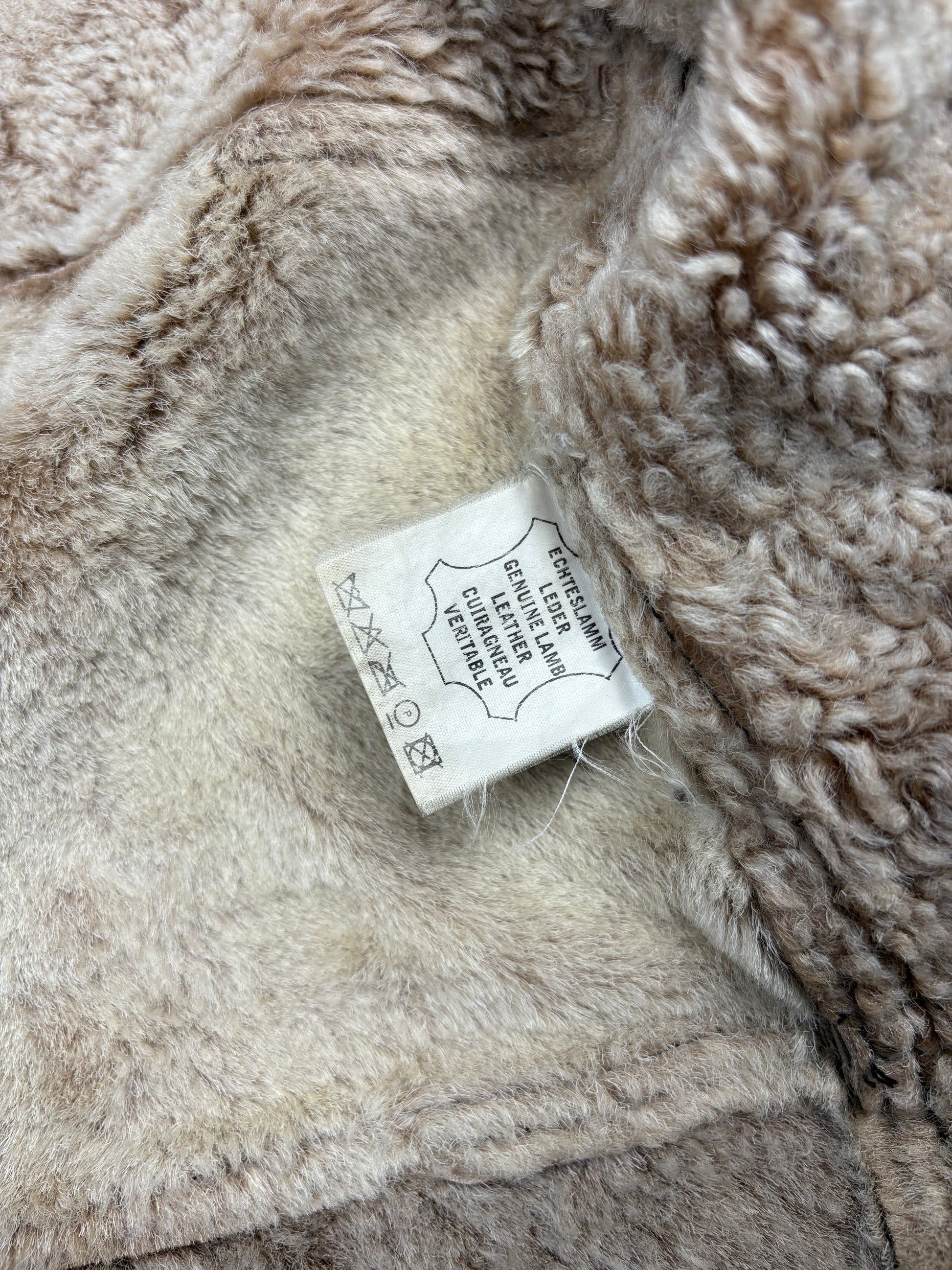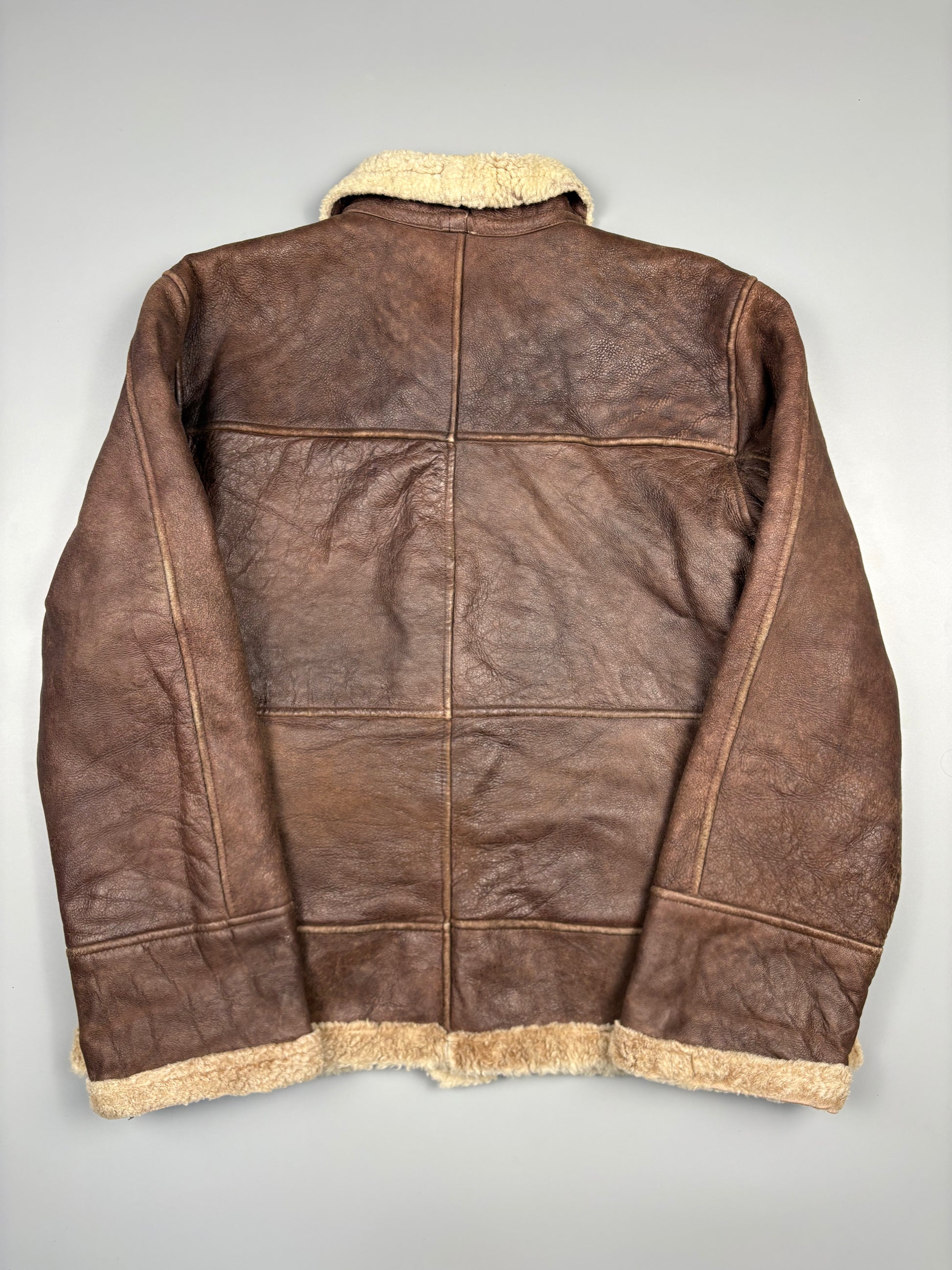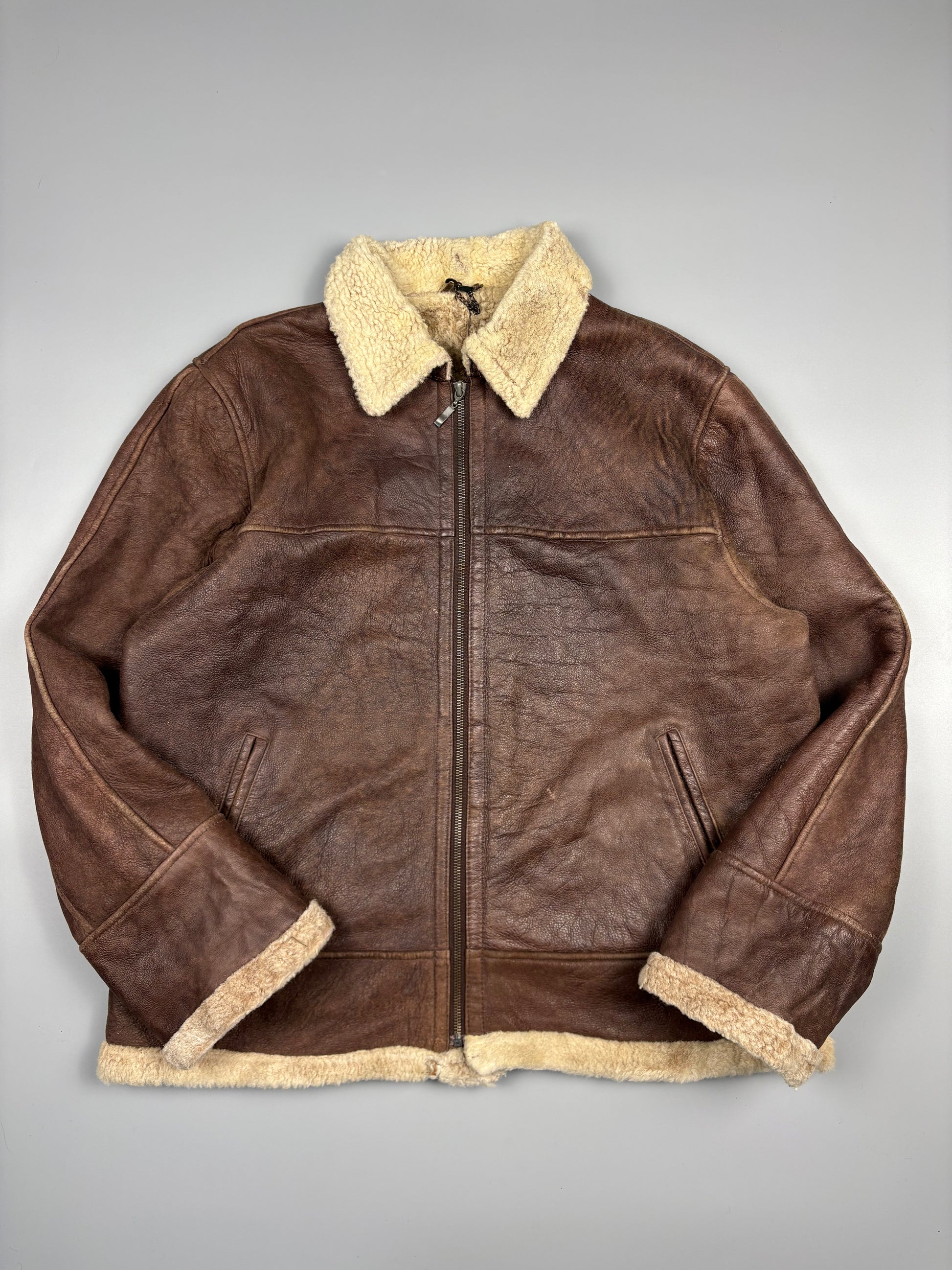 1980s Italian Shearling leather jacket, sheepskin lined + collar. A-2 flight style with two flap front pockets, the jackets in an excellent vintage condition.