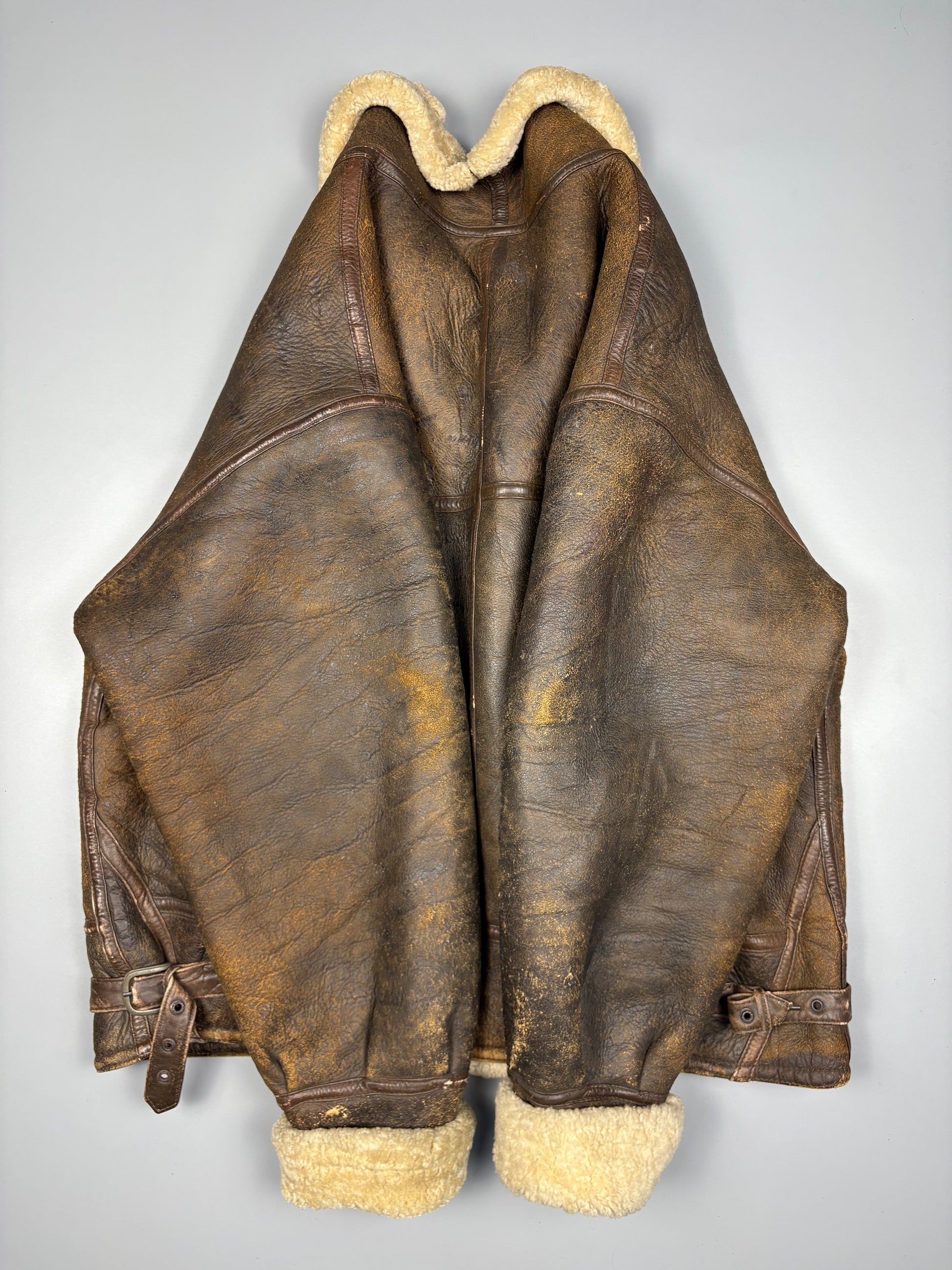 1980s Shearling leather jacket, sheepskin lined + collar. A-2 flight style in an excellent vintage condition.