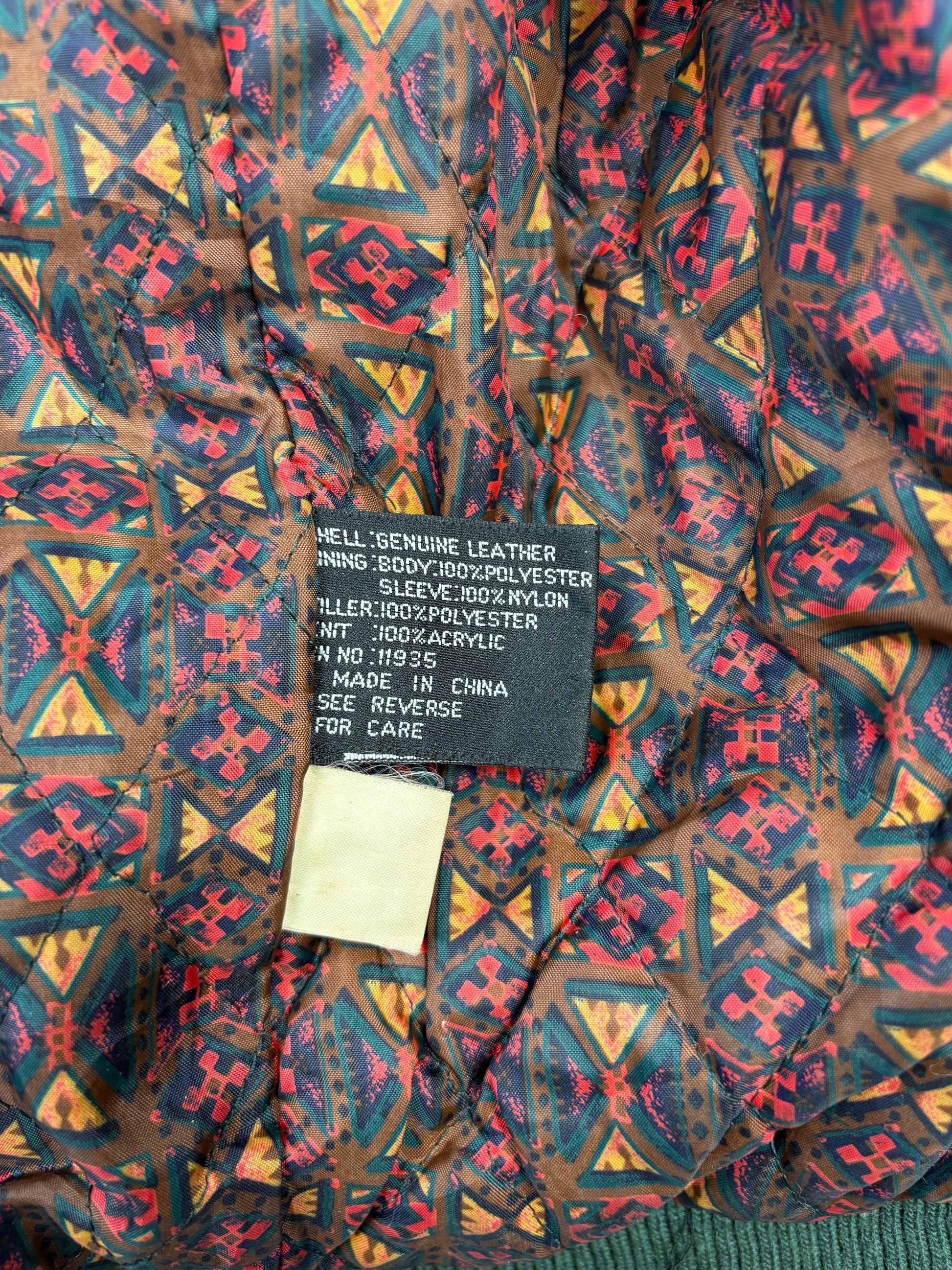 1990s A-2 Flight jacket, genuine leather with a paisley-like lining.