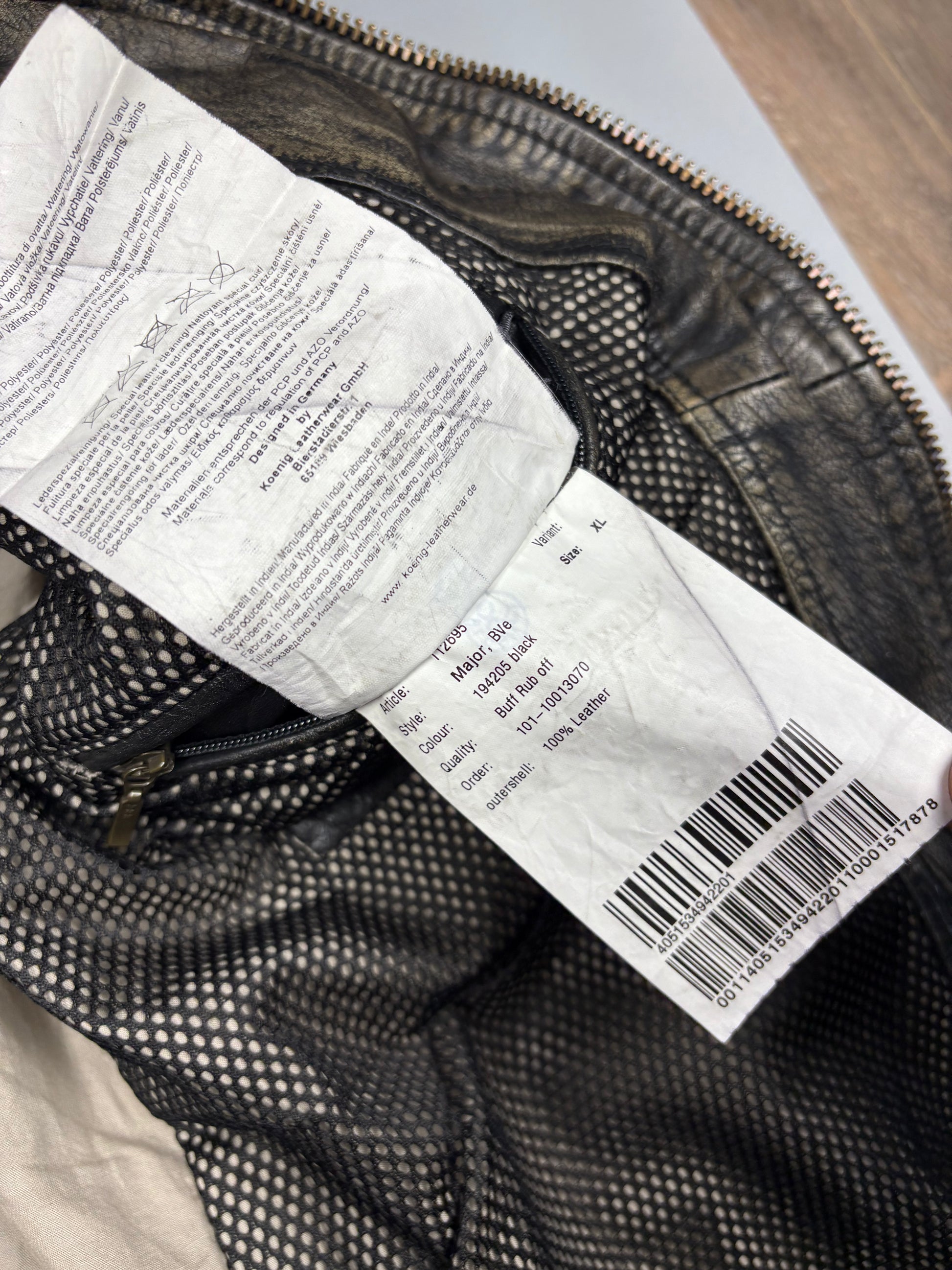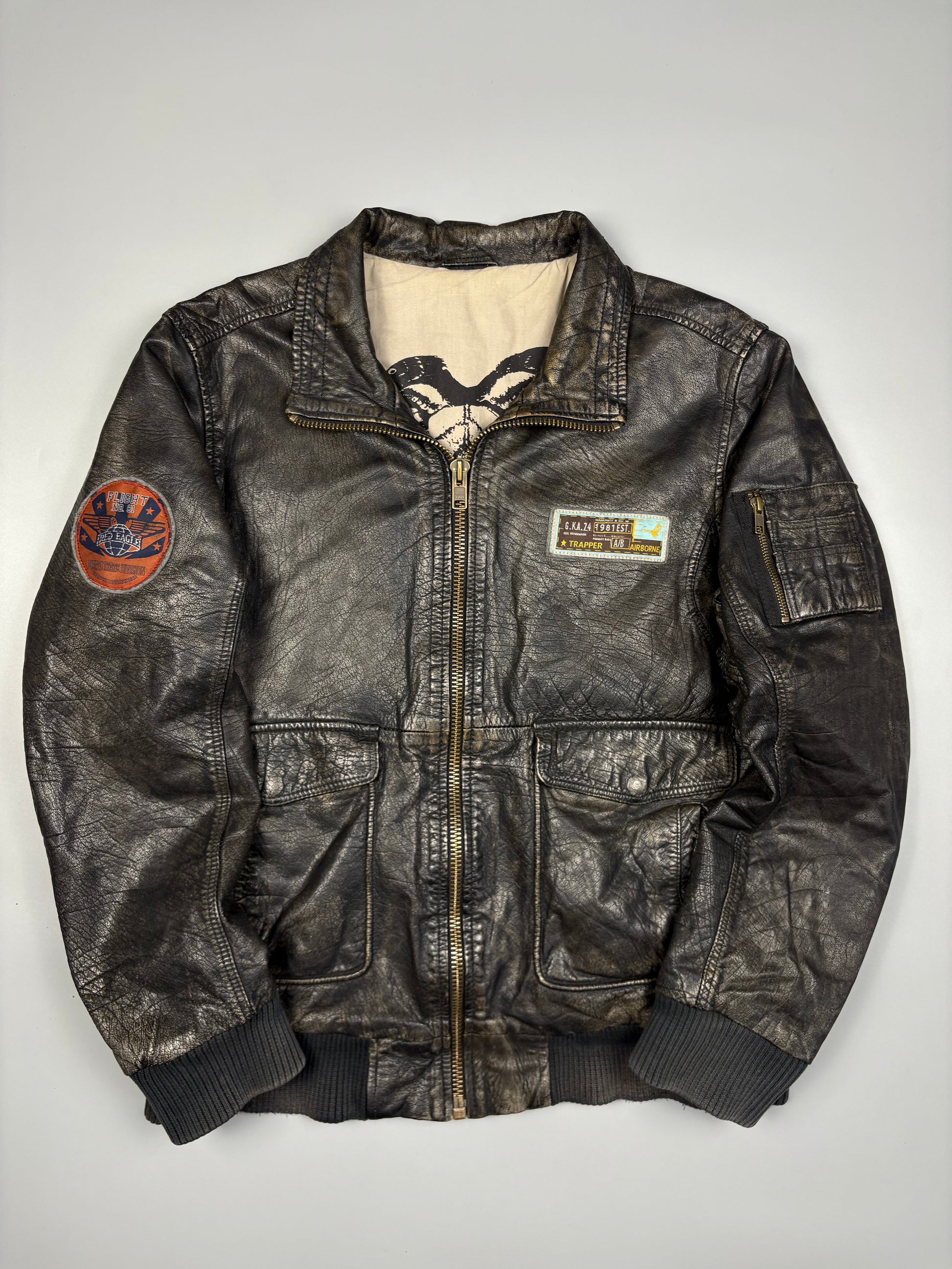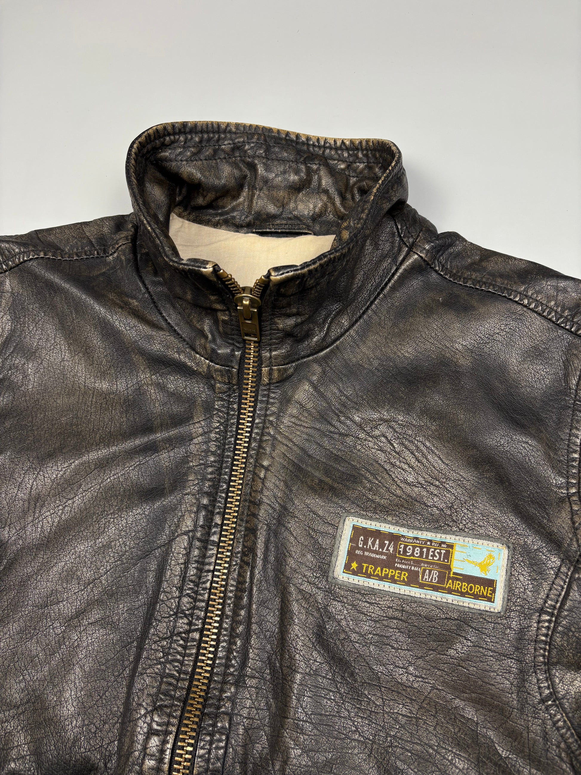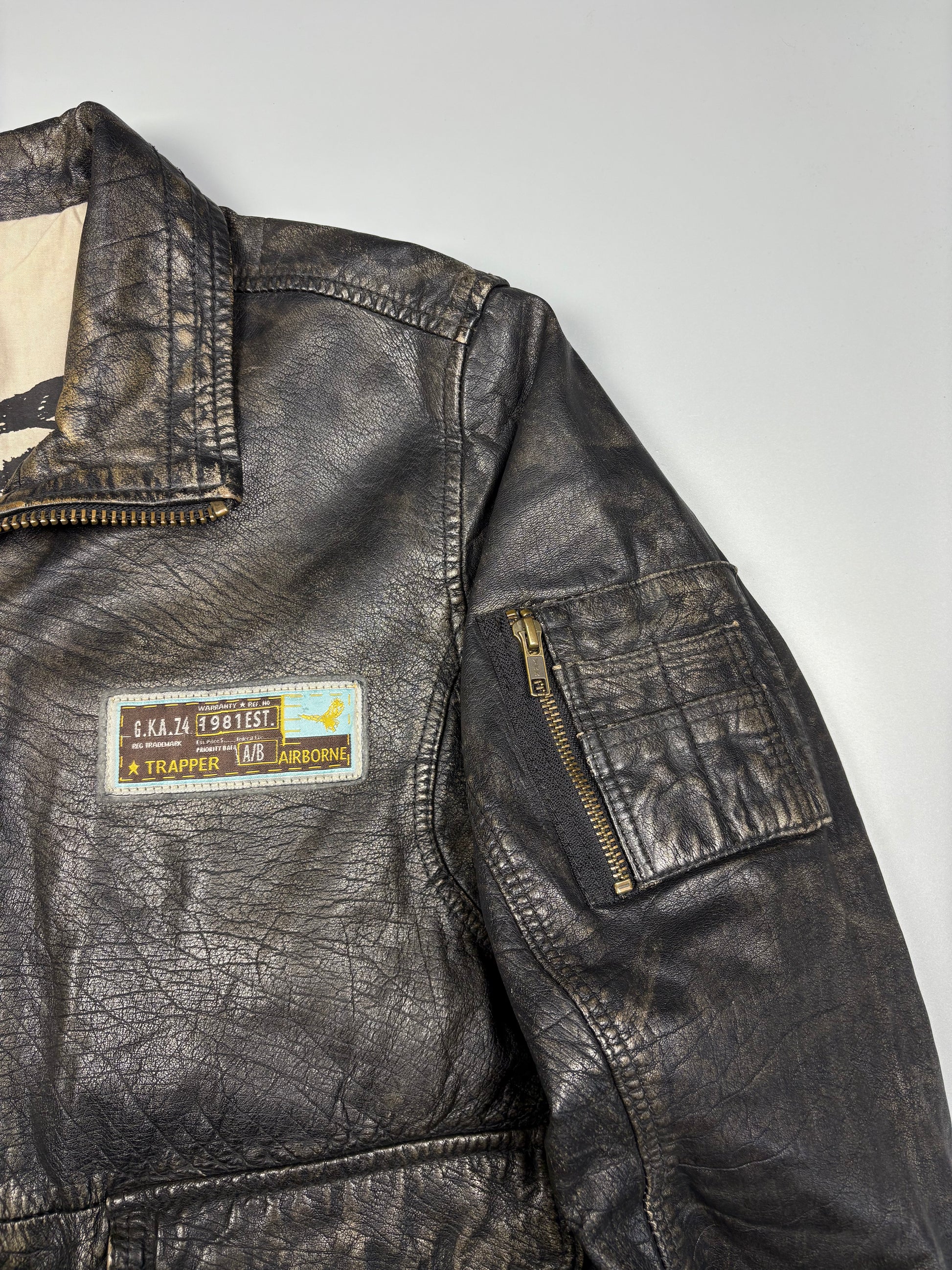 1990s Dark wash full zip leather jacket featuring 'Trapper Leatherwear' flight patches, in a great vintage condition.